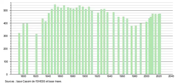 L'évolution du nombre d'habitants est connue à travers les recensements de la population effectués dans la commune depuis 1793. Pour les communes de moins de 10 000 habitants, une enquête de recensement portant sur toute la population est réalisée tous les cinq ans, les populations légales des années intermédiaires étant quant à elles estimées par interpolation ou extrapolation[20]. Pour la commune, le premier recensement exhaustif entrant dans le cadre du nouveau dispositif a été réalisé en 2004[21].