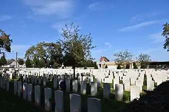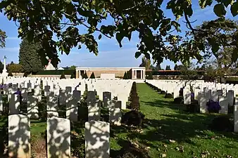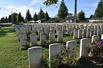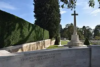 L'extension du cimetière communal de Chauny (communal cemetery extension) a été édifiée après l'Armistice et contient mille six tombes (986 Britanniques et 20 Canadiens), dont 437 ne sont pas identifiés.