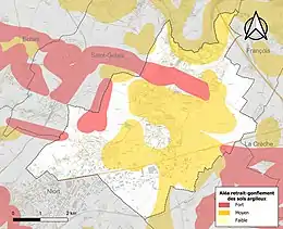 Les mouvements de terrains susceptibles de se produire sur la commune sont des tassements différentiels[21]. Le retrait-gonflement des sols argileux est susceptible d'engendrer des dommages importants aux bâtiments en cas d’alternance de périodes de sécheresse et de pluie[22]. 56,2 % de la superficie communale est en aléa moyen ou fort (54,9 % au niveau départemental et 48,5 % au niveau national)[Carte 2]. Depuis le , en application de la loi ELAN, différentes contraintes s'imposent aux vendeurs, maîtres d'ouvrages ou constructeurs de biens situés dans une zone classée en aléa moyen ou fort[Note 3],[23].