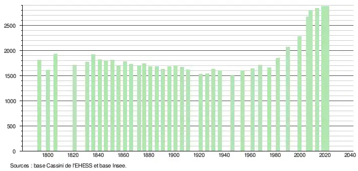 L'évolution du nombre d'habitants est connue à travers les recensements de la population effectués dans la commune depuis 1793. Pour les communes de moins de 10 000 habitants, une enquête de recensement portant sur toute la population est réalisée tous les cinq ans, les populations légales des années intermédiaires étant quant à elles estimées par interpolation ou extrapolation[21]. Pour la commune, le premier recensement exhaustif entrant dans le cadre du nouveau dispositif a été réalisé en 2008[22].