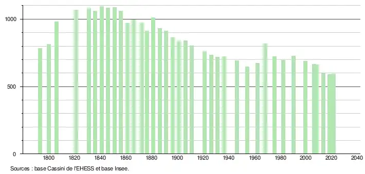 L'évolution du nombre d'habitants est connue à travers les recensements de la population effectués dans la commune depuis 1793. Pour les communes de moins de 10 000 habitants, une enquête de recensement portant sur toute la population est réalisée tous les cinq ans, les populations légales des années intermédiaires étant quant à elles estimées par interpolation ou extrapolation[24]. Pour la commune, le premier recensement exhaustif entrant dans le cadre du nouveau dispositif a été réalisé en 2008[25].