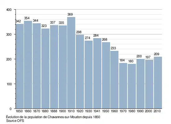 La population de Chavannes-sur-Moudon est de 342 habitants en 1850. Elle reste relativement stable jusqu'en 1910, puis baisse jusqu'à 180 habitants en 1980. Le nombre d'habitants remonte légèrement depuis et atteint 209 en 2010. Le graphique suivant résume l'évolution de la population de Chavannes-sur-Moudon entre 1850 et 2010[9] :