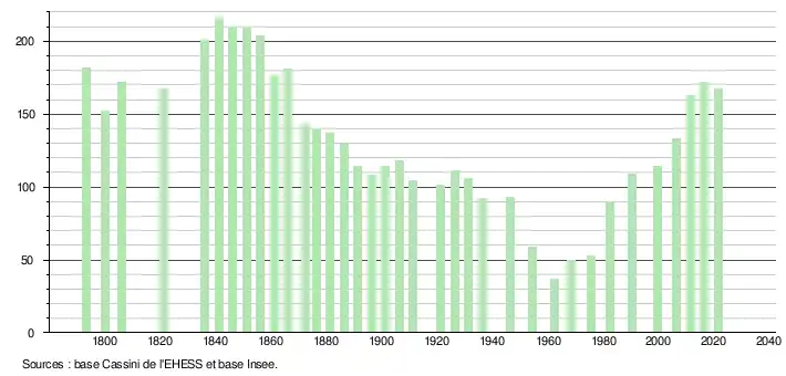 L'évolution du nombre d'habitants est connue à travers les recensements de la population effectués dans la commune depuis 1793. Pour les communes de moins de 10 000 habitants, une enquête de recensement portant sur toute la population est réalisée tous les cinq ans, les populations légales des années intermédiaires étant quant à elles estimées par interpolation ou extrapolation[19]. Pour la commune, le premier recensement exhaustif entrant dans le cadre du nouveau dispositif a été réalisé en 2006[20].