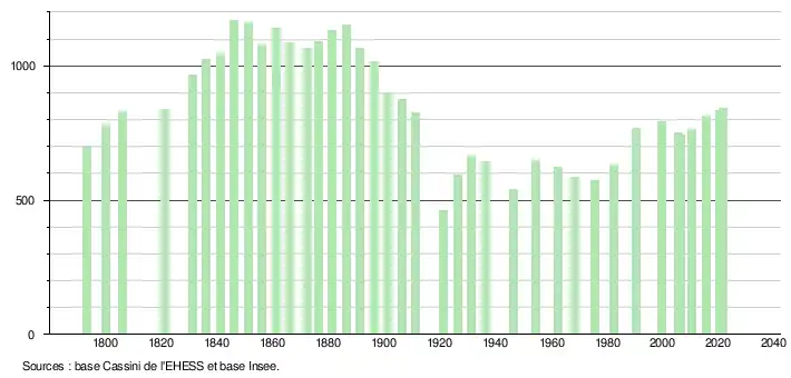 L'évolution du nombre d'habitants est connue à travers les recensements de la population effectués dans la commune depuis 1793. Pour les communes de moins de 10 000 habitants, une enquête de recensement portant sur toute la population est réalisée tous les cinq ans, les populations légales des années intermédiaires étant quant à elles estimées par interpolation ou extrapolation[28]. Pour la commune, le premier recensement exhaustif entrant dans le cadre du nouveau dispositif a été réalisé en 2005[29].