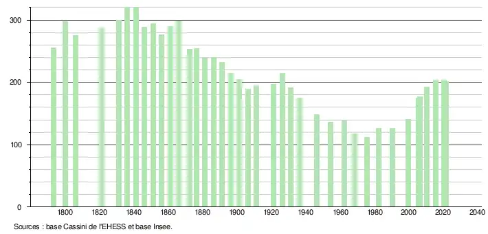L'évolution du nombre d'habitants est connue à travers les recensements de la population effectués dans la commune depuis 1793. Pour les communes de moins de 10 000 habitants, une enquête de recensement portant sur toute la population est réalisée tous les cinq ans, les populations légales des années intermédiaires étant quant à elles estimées par interpolation ou extrapolation[19]. Pour la commune, le premier recensement exhaustif entrant dans le cadre du nouveau dispositif a été réalisé en 2005[20].