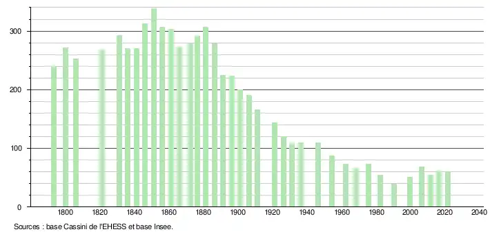 L'évolution du nombre d'habitants est connue à travers les recensements de la population effectués dans la commune depuis 1793. Pour les communes de moins de 10 000 habitants, une enquête de recensement portant sur toute la population est réalisée tous les cinq ans, les populations légales des années intermédiaires étant quant à elles estimées par interpolation ou extrapolation[21]. Pour la commune, le premier recensement exhaustif entrant dans le cadre du nouveau dispositif a été réalisé en 2006[22].