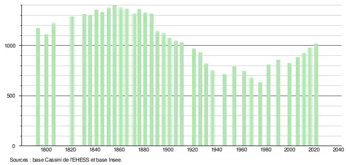 L'évolution du nombre d'habitants est connue à travers les recensements de la population effectués dans la commune depuis 1793. Pour les communes de moins de 10 000 habitants, une enquête de recensement portant sur toute la population est réalisée tous les cinq ans, les populations légales des années intermédiaires étant quant à elles estimées par interpolation ou extrapolation[25]. Pour la commune, le premier recensement exhaustif entrant dans le cadre du nouveau dispositif a été réalisé en 2006[26].