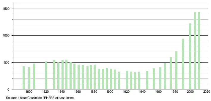 L'évolution du nombre d'habitants est connue à travers les recensements de la population effectués dans la commune depuis 1793. À partir du , les populations légales des communes sont publiées annuellement dans le cadre d'un recensement qui repose désormais sur une collecte d'information annuelle, concernant successivement tous les territoires communaux au cours d'une période de cinq ans. Pour les communes de moins de 10 000 habitants, une enquête de recensement portant sur toute la population est réalisée tous les cinq ans, les populations légales des années intermédiaires étant quant à elles estimées par interpolation ou extrapolation[5]. Pour la commune, le premier recensement exhaustif entrant dans le cadre du nouveau dispositif a été réalisé en 2005[6],[Note 1].