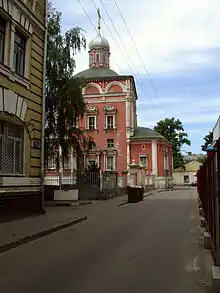Vue sud du chemin Podsossensky, au fond l'immeuble du numéro 19/28, à gauche l'hôtel particulier Prokhorov-Khloudov en jaune.