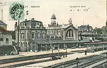 On voit au premier plan les voies de la ligne du chemin de fer secondaire à voie métrique Amiens – Envermeu, et, au second plan, près du bâtiment de la gare, les voies de la ligne Paris – Le Tréport.