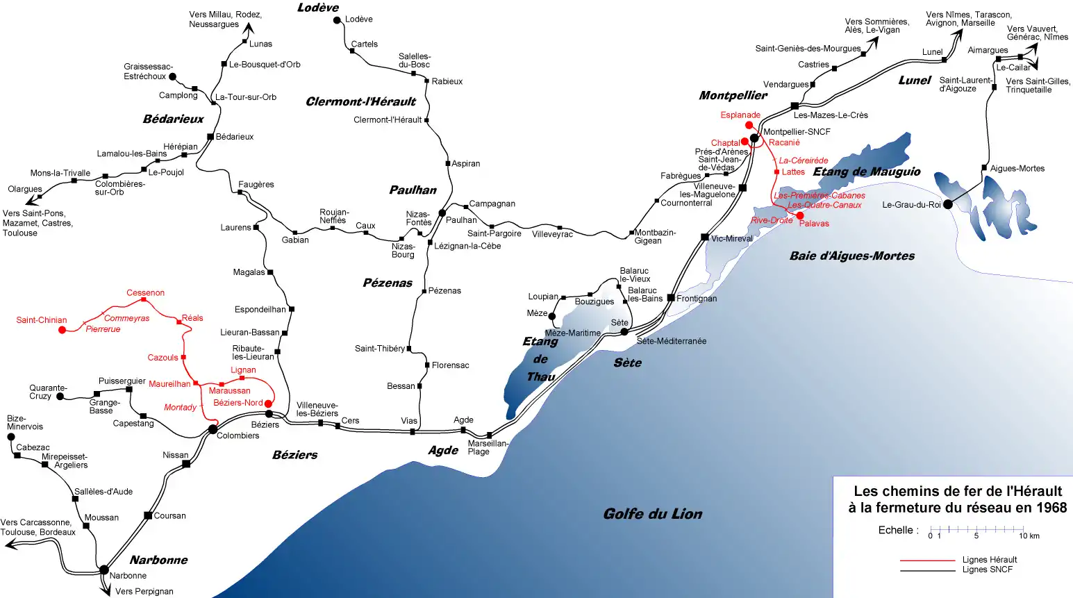 - la ligne de Montpellier-Chaptal à Béziers-Nord, ouverte en 1877 avec utilisation partielle des voies de la Compagnie du Midi et ouverte dans son intégralité, 80 km, en 1902 ;