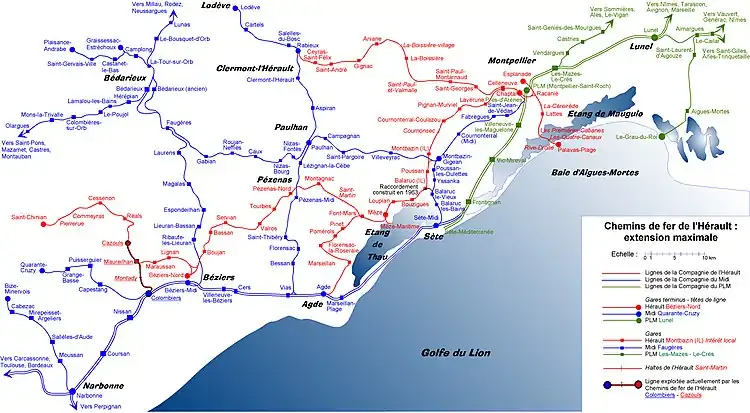 L’extension maximale du réseau de l’Hérault est atteinte en 1913 avec l’ouverture de la ligne de Maureilhan à Colombiers. Par la suite, la compagnie connaîtra bien des vicissitudes. En revanche, cette dernière ligne est toujours exploitée de nos jours par le département.