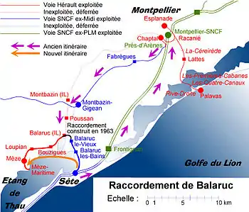 - le raccordement de Balaruc-le-Vieux, 1,5 km, construit en 1963 pour assurer la desserte directe des marchandises entre Sète et Mèze via une portion de l’ancienne ligne Midi de Sète à Montbazin-Gigean et une portion de la ligne de l'Intérêt local de Montpellier à Béziers.