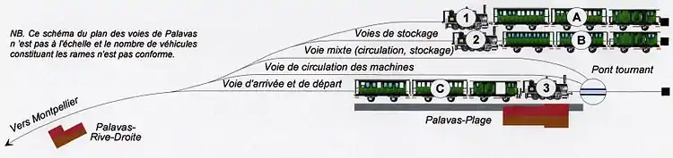 - La configuration à voie unique en impasse de la gare de l'Esplanade impose un nombre de machines supérieur à celui des rames : au passage à Racanié d'un train montant tracté par la machine 1, la machine 2 isolée (haut le pied) suit le train en marche à vue. Au terminus, pendant que les voyageurs à l'arrivée quittent la rame puis que les voyageurs au départ montent dans la même rame, la machine 1 est dételée et la machine 2 attelée en queue de rame. Le train repart vers Palavas tracté par la machine 2 ; il est suivi de la machine 1 qui va attendre à Racanié le passage du train montant suivant et ainsi de suite.