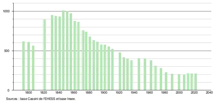 L'évolution du nombre d'habitants est connue à travers les recensements de la population effectués dans la commune depuis 1793. Pour les communes de moins de 10 000 habitants, une enquête de recensement portant sur toute la population est réalisée tous les cinq ans, les populations légales des années intermédiaires étant quant à elles estimées par interpolation ou extrapolation[18]. Pour la commune, le premier recensement exhaustif entrant dans le cadre du nouveau dispositif a été réalisé en 2006[19].