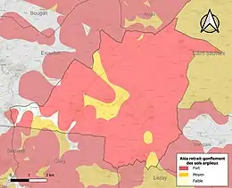 Les mouvements de terrains susceptibles de se produire sur la commune sont des tassements différentiels[17]. Le retrait-gonflement des sols argileux est susceptible d'engendrer des dommages importants aux bâtiments en cas d’alternance de périodes de sécheresse et de pluie[18]. 97,4 % de la superficie communale est en aléa moyen ou fort (54,9 % au niveau départemental et 48,5 % au niveau national)[Carte 2]. Depuis le , en application de la loi ELAN, différentes contraintes s'imposent aux vendeurs, maîtres d'ouvrages ou constructeurs de biens situés dans une zone classée en aléa moyen ou fort[Note 2],[19].