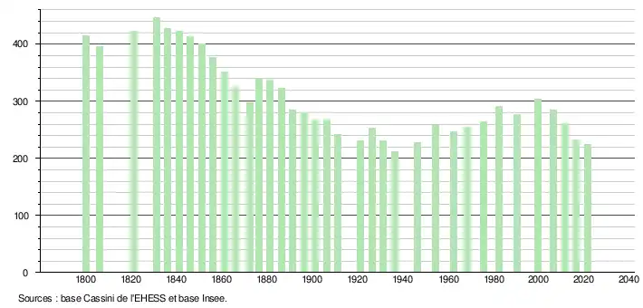 L'évolution du nombre d'habitants est connue à travers les recensements de la population effectués dans la commune depuis 1800. Pour les communes de moins de 10 000 habitants, une enquête de recensement portant sur toute la population est réalisée tous les cinq ans, les populations légales des années intermédiaires étant quant à elles estimées par interpolation ou extrapolation[41]. Pour la commune, le premier recensement exhaustif entrant dans le cadre du nouveau dispositif a été réalisé en 2006[42].