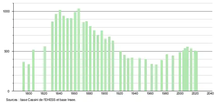 L'évolution du nombre d'habitants est connue à travers les recensements de la population effectués dans la commune depuis 1793. Pour les communes de moins de 10 000 habitants, une enquête de recensement portant sur toute la population est réalisée tous les cinq ans, les populations légales des années intermédiaires étant quant à elles estimées par interpolation ou extrapolation[32]. Pour la commune, le premier recensement exhaustif entrant dans le cadre du nouveau dispositif a été réalisé en 2004[33].