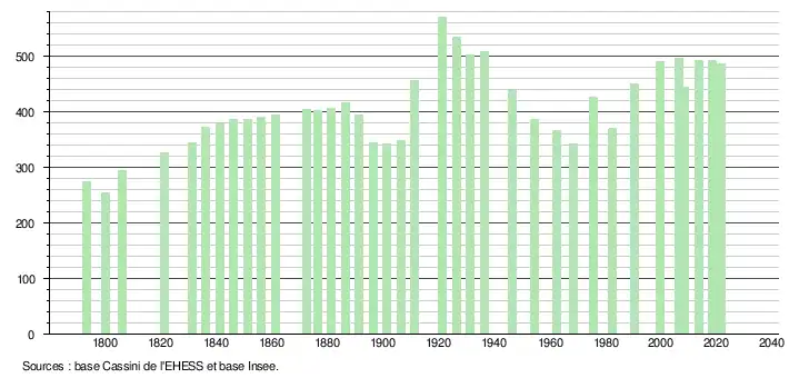 L'évolution du nombre d'habitants est connue à travers les recensements de la population effectués dans la commune depuis 1793. Pour les communes de moins de 10 000 habitants, une enquête de recensement portant sur toute la population est réalisée tous les cinq ans, les populations légales des années intermédiaires étant quant à elles estimées par interpolation ou extrapolation[27]. Pour la commune, le premier recensement exhaustif entrant dans le cadre du nouveau dispositif a été réalisé en 2008[28].
