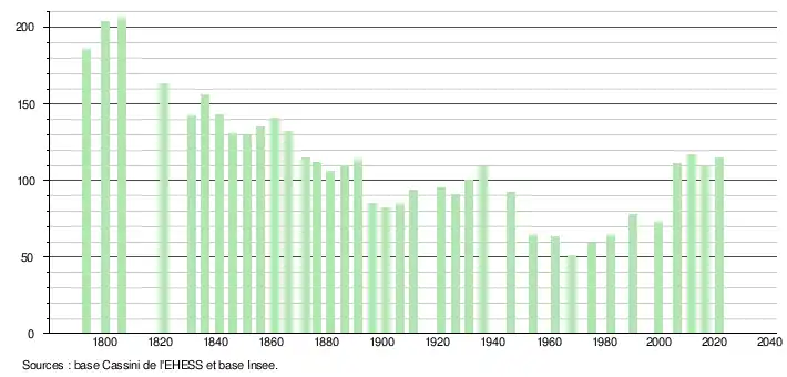 L'évolution du nombre d'habitants est connue à travers les recensements de la population effectués dans la commune depuis 1793. Pour les communes de moins de 10 000 habitants, une enquête de recensement portant sur toute la population est réalisée tous les cinq ans, les populations légales des années intermédiaires étant quant à elles estimées par interpolation ou extrapolation[23]. Pour la commune, le premier recensement exhaustif entrant dans le cadre du nouveau dispositif a été réalisé en 2006[24].