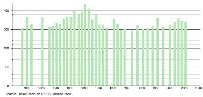 L'évolution du nombre d'habitants est connue à travers les recensements de la population effectués dans la commune depuis 1793. Pour les communes de moins de 10 000 habitants, une enquête de recensement portant sur toute la population est réalisée tous les cinq ans, les populations légales des années intermédiaires étant quant à elles estimées par interpolation ou extrapolation[28]. Pour la commune, le premier recensement exhaustif entrant dans le cadre du nouveau dispositif a été réalisé en 2006[29].
