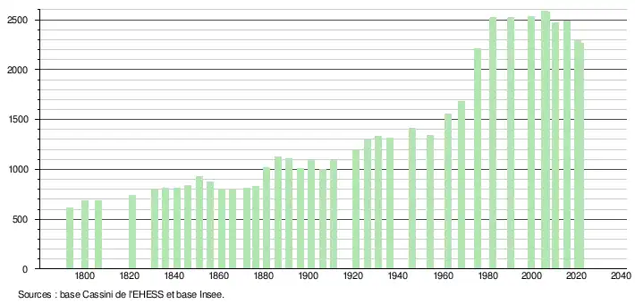 L'évolution du nombre d'habitants est connue à travers les recensements de la population effectués dans la commune depuis 1793. Pour les communes de moins de 10 000 habitants, une enquête de recensement portant sur toute la population est réalisée tous les cinq ans, les populations légales des années intermédiaires étant quant à elles estimées par interpolation ou extrapolation[20]. Pour la commune, le premier recensement exhaustif entrant dans le cadre du nouveau dispositif a été réalisé en 2005[21].