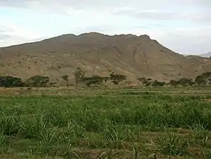 En contrebas, des rizières et des champs de canne à sucre enserrent la ville grâce à l'irrigation sans laquelle il n'y aurait qu'une pampa désertique.