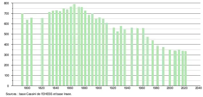 L'évolution du nombre d'habitants est connue à travers les recensements de la population effectués dans la commune depuis 1793. Pour les communes de moins de 10 000 habitants, une enquête de recensement portant sur toute la population est réalisée tous les cinq ans, les populations légales des années intermédiaires étant quant à elles estimées par interpolation ou extrapolation[20]. Pour la commune, le premier recensement exhaustif entrant dans le cadre du nouveau dispositif a été réalisé en 2007[21].