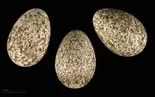 Le nid est fait à même le sol et trois ou quatre œufs y sont pondus, blancs brunâtre, rougeâtre ou verdâtre, et tachetés de gris brun ou de jaune brun et mesurant 23-24 cm × 17-18 cm[1].