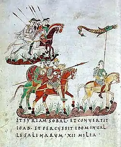 La selle rigide autorise une utilisation plus efficace de l'étrier[12]. Il est développé en Chine, et largement utilisé dans ce pays en 477 de l’ère chrétienne[115]. Au VIIe siècle, principalement en raison des invasions venues d'Asie centrale, comme celle des Avars, les étriers arrivent en Europe[116]. Les cavaliers européens les adoptent vraisemblablement au cours du VIIIe siècle[117]. Leur adoption est lente. La plus ancienne source iconographique représentant l'étrier remonte à un manuscrit de la fin du IXe siècle, conservé à l'abbaye de Saint-Gall[118].