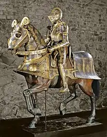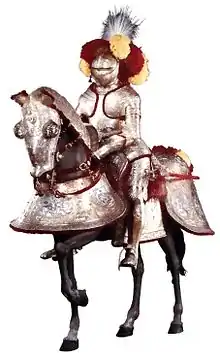 Sous la selle, le caparaçon ou le tapis de selle sont parfois utilisés, et peuvent être décorés ou brodés d'emblèmes et de couleurs héraldiques, ainsi que des armes de certaines familles[113]. Le caparaçon est la pièce de tissu couvrant le cheval afin de le protéger des coups d'épée et des flèches au niveau des jambes, de l'encolure et du poitrail. Ainsi, les premières housses de guerre sont plus longues par-devant que par-derrière. La housse de poitrail enveloppe la tête du cheval au-dessus des naseaux, deux trous étant prévus pour les yeux. Les oreilles peuvent être découvertes ou protégées. Le caparaçon est doublé au niveau de l'encolure et de la croupe. Il est employé à partir de 1220.