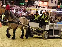 Trouver le matériel adéquat peut poser des difficultés. Le matériel de traction hippomobile n'est plus utilisé à grande échelle en France depuis le début du XXe siècle et celui qui a été conservé s'est souvent dégradé. De plus, ce matériel n'est plus adapté aux usages modernes du cheval territorial. Les fabricants sont désormais peu nombreux et travaillent souvent de manière artisanale[75]. Les progrès réalisés dans la conception du matériel et des véhicules attelés permettent de réduire les nuisances : la plupart des harnachements d'attelage sont équipés d'un système de collecte des crottins avant qu'ils ne tombent à terre, et il existe des fers réduisant le bruit causé par les sabots des chevaux[73].