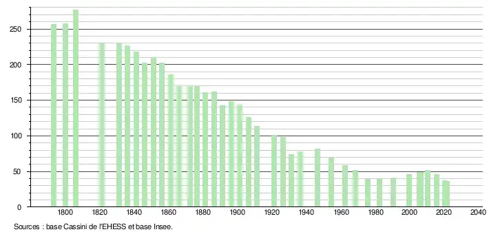 L'évolution du nombre d'habitants est connue à travers les recensements de la population effectués dans la commune depuis 1793. Pour les communes de moins de 10 000 habitants, une enquête de recensement portant sur toute la population est réalisée tous les cinq ans, les populations légales des années intermédiaires étant quant à elles estimées par interpolation ou extrapolation[16]. Pour la commune, le premier recensement exhaustif entrant dans le cadre du nouveau dispositif a été réalisé en 2005[17].