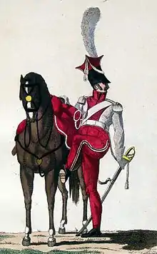 Cette tenue est toutefois abandonnée lorsque le 1er escadron du régiment part combattre en Espagne[15]. En campagne, le chapska est recouvert d'un drap noir, tandis que la kurtka et le pantalon arborent la couleur grise[16]. Les épaulettes, les gants et les buffleteries blanches sont conservées. Le manteau gris est roulé en travers du corps[16].