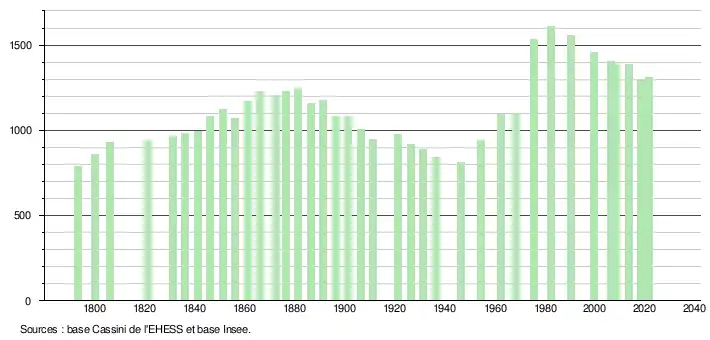 L'évolution du nombre d'habitants est connue à travers les recensements de la population effectués dans la commune depuis 1793. Pour les communes de moins de 10 000 habitants, une enquête de recensement portant sur toute la population est réalisée tous les cinq ans, les populations légales des années intermédiaires étant quant à elles estimées par interpolation ou extrapolation[14]. Pour la commune, le premier recensement exhaustif entrant dans le cadre du nouveau dispositif a été réalisé en 2008[15].