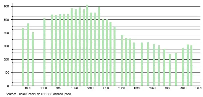 L'évolution du nombre d'habitants est connue à travers les recensements de la population effectués dans la commune depuis 1793. À partir du , les populations légales des communes sont publiées annuellement dans le cadre d'un recensement qui repose désormais sur une collecte d'information annuelle, concernant successivement tous les territoires communaux au cours d'une période de cinq ans. Pour les communes de moins de 10 000 habitants, une enquête de recensement portant sur toute la population est réalisée tous les cinq ans, les populations légales des années intermédiaires étant quant à elles estimées par interpolation ou extrapolation[3]. Pour la commune, le premier recensement exhaustif entrant dans le cadre du nouveau dispositif a été réalisé en 2005[4],[Note 1].