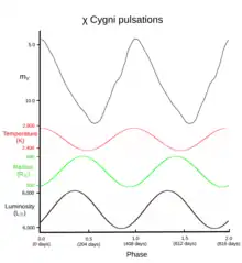 χ Cygni est bien plus grande mais aussi plus froide que le Soleil. Malgré sa faible température de surface, elle est des milliers de fois plus lumineuse que le Soleil en raison de sa grande taille. Elle pulse aussi bien en rayon et en température, qui varient sur une période d'environ 409 jours. Sa température varie entre 2 400 et 2 700 K et son rayon entre 350 et 480 R☉. Ces pulsations font que sa luminosité varie entre 6 000 et 9 000 L☉, et elles expliquent pourquoi la magnitude visuelle de l'étoile peut varier de plus de 10 magnitudes[7]. Ce grand intervalle de variation est créé par un déplacement du rayonnement électromagnétique vers l'infrarouge quand sa température décroît, et par la formation à des températures froides de molécules qui absorbent sa lumière visuelle[33].