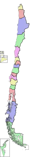 Le Chili, en forme longue la république du Chili (en espagnol Chile et República de Chile), est un pays d’Amérique du Sud partageant ses frontières avec le Pérou et la Bolivie au nord et avec l’Argentine au nord-est, à l'est et au sud-est. Tout son territoire forme une étroite bande continentale allant du désert d'Atacama, au nord, jusqu'au cap Horn, au sud, étant exclusivement bordé par l'océan Pacifique sur sa façade ouest. L'île de Pâques, située à 3 000 km à l'ouest de Valparaíso dans l'océan Pacifique, fait partie du Chili depuis 1888[7]. De même, le Chili possède depuis 1935 l'archipel Juan Fernández[8] situé à environ 700 kilomètres à l'ouest du pays abritant la célèbre île Robinson Crusoé. La superficie totale du pays est de 756 102 km2[1]. La capitale du Chili est Santiago[9]. Les autres villes importantes sont le grand port maritime de Valparaíso, la célèbre station balnéaire de Viña del Mar et la ville industrielle d'Antofagasta. Punta Arenas est la plus grande ville des terres australes du continent américain.