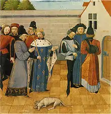 Le meurtre de Galswinthe par Chilpéric Ier dans les Grandes Chroniques de France de Charles V, vers 1375-1380 (Bibliothèque nationale de France, département des manuscrits, ms. Français 2813, fo 31 ro). | |