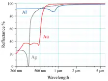 La réflectivité de l’or Au, de l’argent Ag et de l’aluminium Al est représentée sur la figure à droite. L’œil humain perçoit le rayonnement électromagnétique ayant une longueur d’onde proche de 600 nm comme du jaune. Comme on le voit à partir de ce spectre de réflectance, l’or paraît jaune parce qu’il absorbe la lumière bleue plus qu’il n’absorbe les autres longueurs d’onde visibles de la lumière ; la lumière réfléchie, qui est celle que nous percevons, est donc dépourvue de bleu par rapport à la lumière incidente. Puisque le jaune est complémentaire du bleu, cela se traduit par le fait qu’un morceau d’or semble jaune (sous une lumière blanche) aux yeux humains.