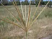 L'inflorescence, ascendante ou étalée, de couleur claire brun-verdâtre, rarement jaune, vire au brun foncé à maturité. Elle est composée de 6 à 15 (voire 3 à 20) racèmes spiciformes de 4 à 15 cm de long, disposés de façon digitée (verticille simple) ou sub-digitée (verticille double). Les épillets fertiles, sessiles, comprimés latéralement, comprennent un fleuron fertile et 3 à 4 fleurons réduits, stériles ou nus, vers l'apex. Ils mesurent de 2,5 à 4 cm de long et se désarticulent à maturité sous le fleuron fertile. Parfois tous les fleurons sont hermaphrodites et fertiles. Les épillets sont sous-tendus par deux glumes semblables, membraneuses, lancéolées, persistantes, atteignant l'apex des fleurons. La glume supérieure atteint 2 à 4 mm de long. La glume inférieure plus courte à une longueur égale à 60 à 70 % de celle de la glume supérieure. Les fleurons fertiles ont une lemme munie d'une arête de 1 à 10 mm de long (la longueur des arêtes peut être utile pour différencier les cultivars). Ils comptent deux lodicules charnus, 3 anthères et 2 stigmates[3],[2].