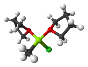 En solution dans le tétrahydrofurane, l'atome de magnésium, en vert clair au centre, est coordonné à deux molécules de THF.