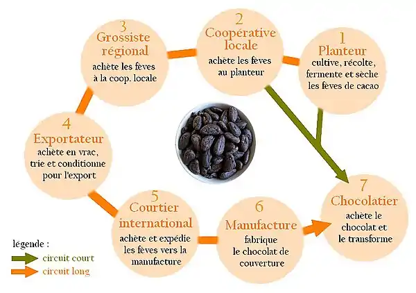 Le tableau suivant répertorie les principaux pays producteurs de fèves de cacao, les variétés qui y sont cultivées, les arômes correspondants — formés lors de la fermentation et le séchage de la fève de cacao[90],[91] — et leur part de la production mondiale calculée en 2017. Les trois plus gros producteurs au monde sont la Côte d'Ivoire (33 % de la production mondiale[92]), le Ghana (18 %[93]) et l'Indonésie (7,45 % [94]).