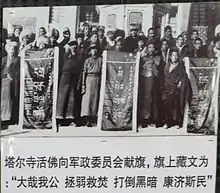 Lorsque les communistes arrivent au pouvoir en 1949, l'entourage du panchen-lama décide de lier son sort aux nouveaux responsables et envoie, le 1er octobre 1949, au nom du nouveau panchen-lama[8], alors âgé de onze ans, des télégrammes à Mao, Zhu De et Peng Dehuai affirmant son soutien à l’unification de la Chine[9]. De même, le 31 janvier 1950, il envoya à Mao un autre télégramme appelant à la libération du Tibet[10].