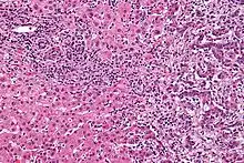 Dans le cas d'un cholangiocarcinome intra-hépatique, une hépatectomie partielle mais large est souvent requise. Celle-ci doit laisser un foie d'une taille suffisante (il doit rester plus de 0,5 % du poids corporel en foie sain[75]) pour qu'il puisse se régénérer tout en supprimant complètement la tumeur[76],[77]. Il existe de nombreuses contre-indications à une opération aussi complexe. Les résultats de ce type d'acte (et les facteurs ayant de l'influence sur ceux-ci) restent incertains mais montrent une amélioration du taux de survie à un, trois et cinq ans[78].