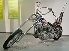 - Dans le film Easy Rider (1969) de Dennis Hopper, dans lequel deux motards hippies, Wyatt (Peter Fonda) et Billy (Dennis Hopper) voyagent à travers l'Amérique profonde au guidon de leur choppers, explique bien le mode de vie empreint de liberté motorisée lié à ce type de moto.