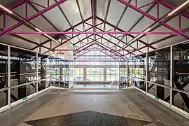 La station en surface est installée dans un bâtiment couvert, elle dispose d'un accès au centre des voies avec accès à une mezzanine en relation avec les quais latéraux par des escaliers fixes[2].