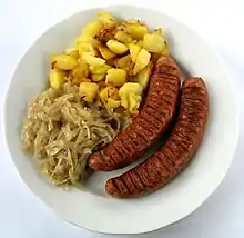 Le plat de Bratwurst (de) avec choucroute et pommes de terre sautées représente la cuisine allemande, surtout à l'étranger.