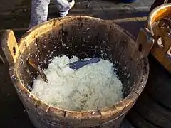 Industriellement, la fermentation se fait plutôt dans des cuves en ciment ou en plastique, et un brassage journalier avec un ajout de vinaigre au vin blanc permet d'accélérer le processus, qui ne met alors qu'environ deux semaines.