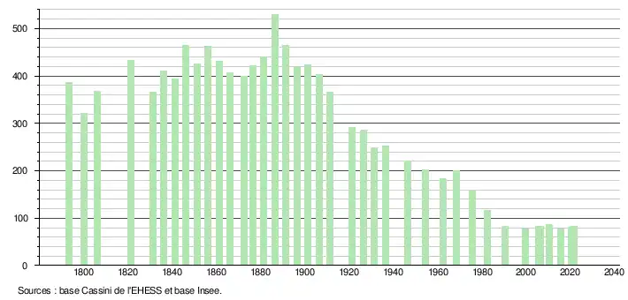L'évolution du nombre d'habitants est connue à travers les recensements de la population effectués dans la commune depuis 1793. Pour les communes de moins de 10 000 habitants, une enquête de recensement portant sur toute la population est réalisée tous les cinq ans, les populations légales des années intermédiaires étant quant à elles estimées par interpolation ou extrapolation[14]. Pour la commune, le premier recensement exhaustif entrant dans le cadre du nouveau dispositif a été réalisé en 2005[15].